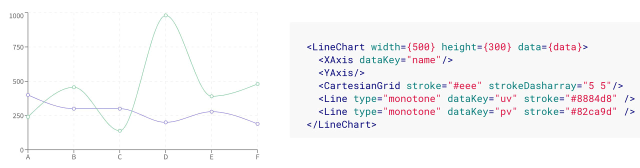 Recharts 2.13: Chart Library Built with React and D3 — Easy to deploy with declarative components, and native SVG support. Line, bar, scatter, composed, pie, and radar charts are offered. There are lots of examples, complete with code. GitHub repo. recharts |
